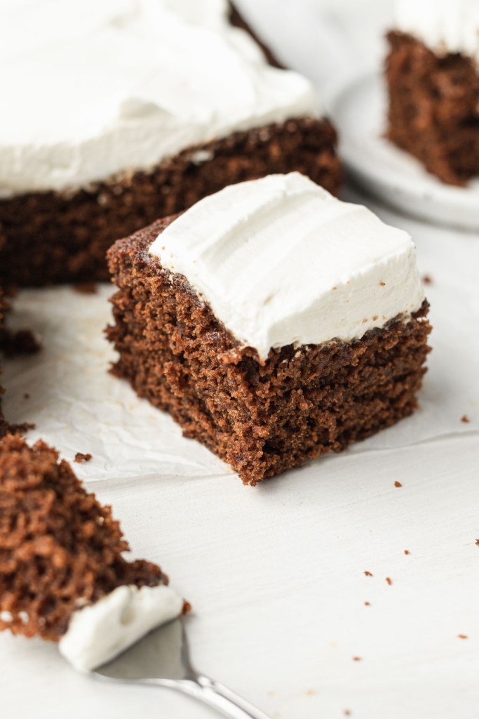 Cinnamon, ginger, and cloves impart that classic cookie flavor into this moist gingerbread cake. I topped this cake with whipped cream, but cream cheese frosting or a simple dusting of powdered sugar would be just as delicious!