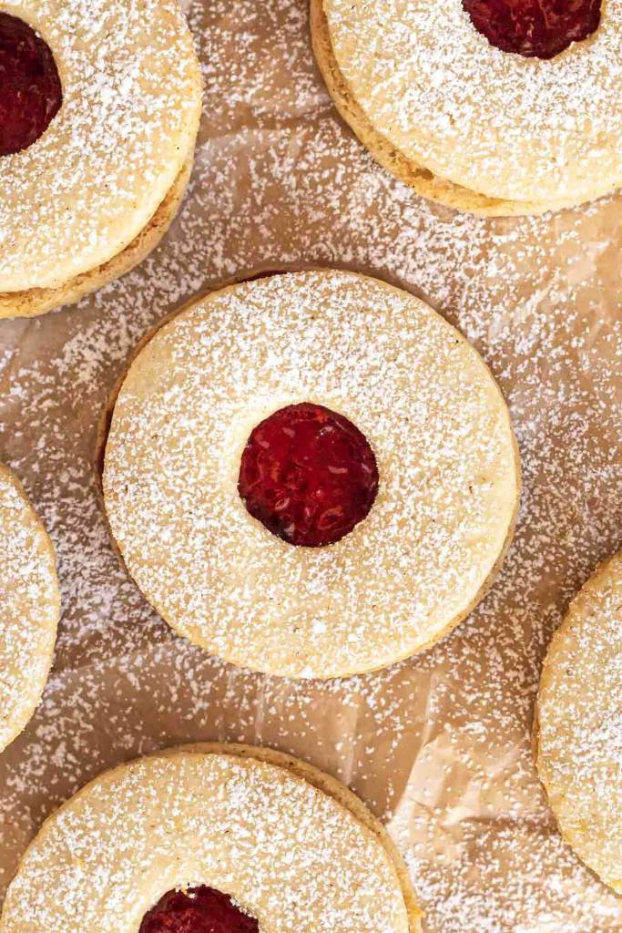 Traditional raspberry Linzer cookies have an interesting history. They’re named after the Austrian Linzer Torte, which is a type of pastry that features a buttery lattice top that sits over a jam filling.