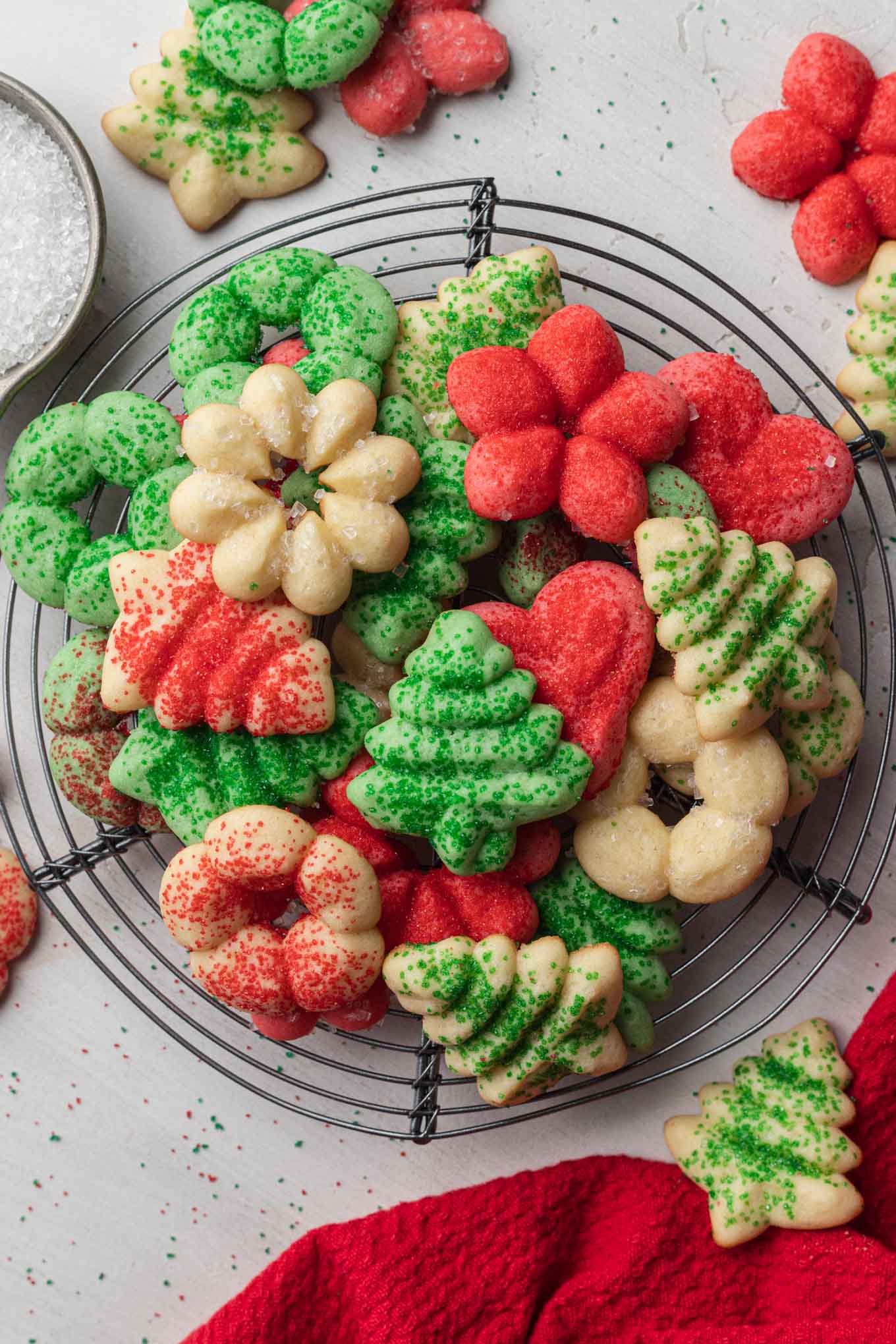 No holiday dessert table is complete without a heaping plate of festive spritz cookies! These classic Christmas cookies are buttery and crisp like shortbread, but they melt in your mouth just like soft sugar cookies.