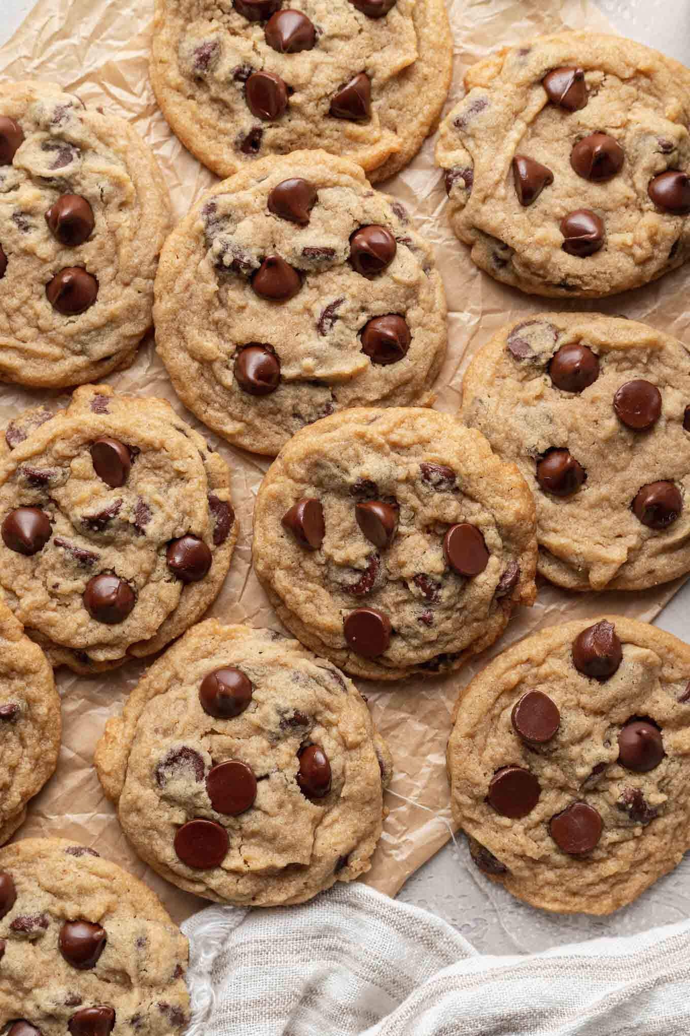 These are better than traditional! It seems like the ratio of brown to white sugar is higher than usual? Anyway whatever the flavor difference is, I love them. I just happened to be out of eggs so I found this recipe. They’re soft but crispy at the edge, and taste so good. The dough is a different texture than I was used to but they spread just the right amount. I may make these next time even if I have eggs.