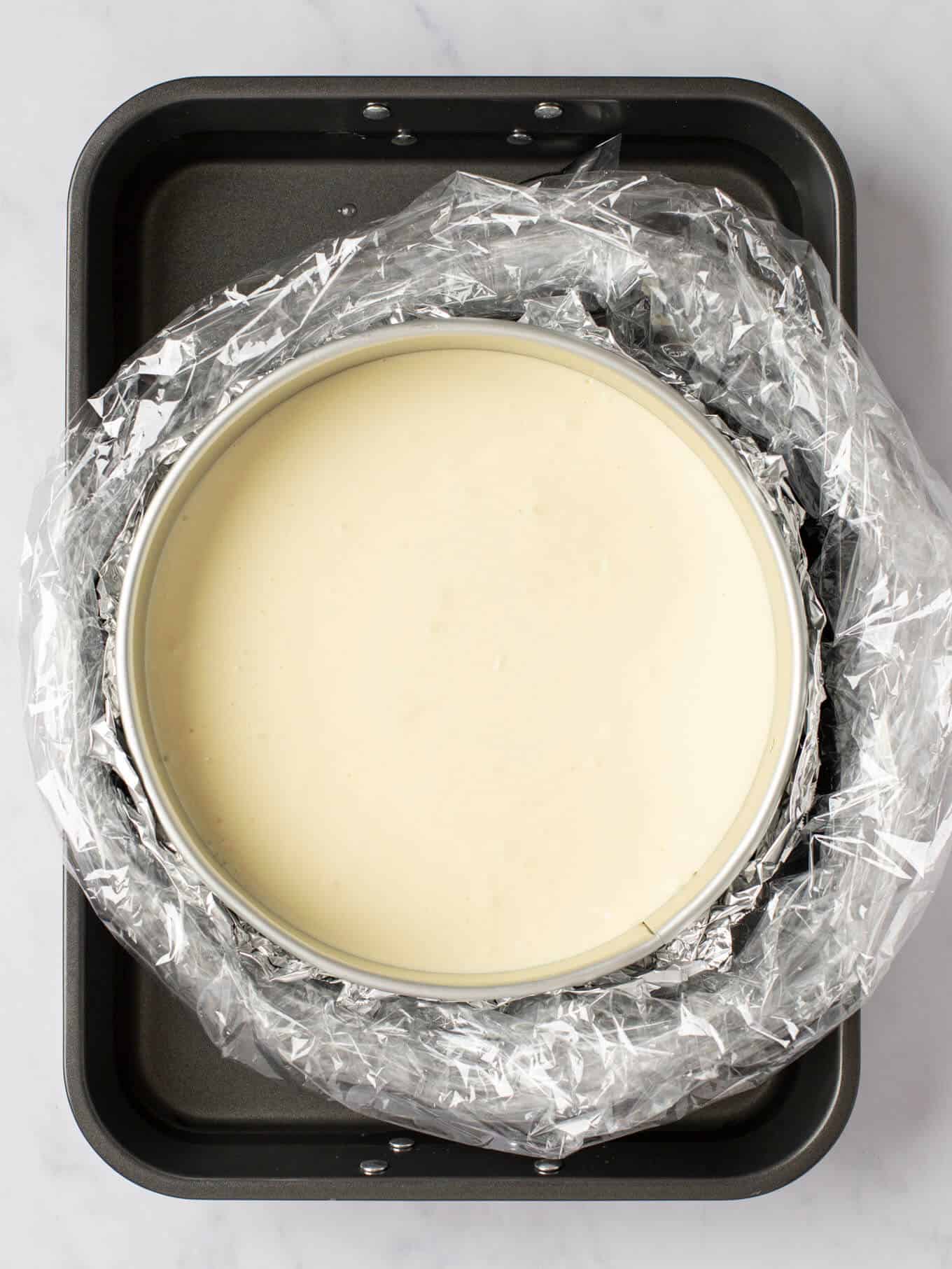 - Make the water bath: Add the boiling water you started before the filling to a large roasting pan until it is about 1-inch deep. Carefully place the wrapped springform pan into the roasting pan. Make sure to be very careful because the water will be hot!