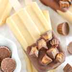 Peanut butter popsicles topped with magic shell and mini peanut butter cups. These Peanut Butter Cup Pudding Pops are a delicious and easy summer treat!