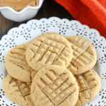Scoop out two tablespoon sized pieces of dough onto the prepared baking sheet (I usually get about 7 cookies). Gently press down with a fork on the top of each cookie to make a small criss-cross pattern.