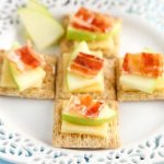 Slice the smoked gouda cheese and bacon into small pieces. Cut each piece of the thinly sliced apples in half.