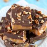 Add half of the fudge to the prepared baking pan and smooth it out. Add all of the caramel on top and evenly distribute it on top of the fudge. Add the remaining half of the fudge and spread it out evenly over the caramel.